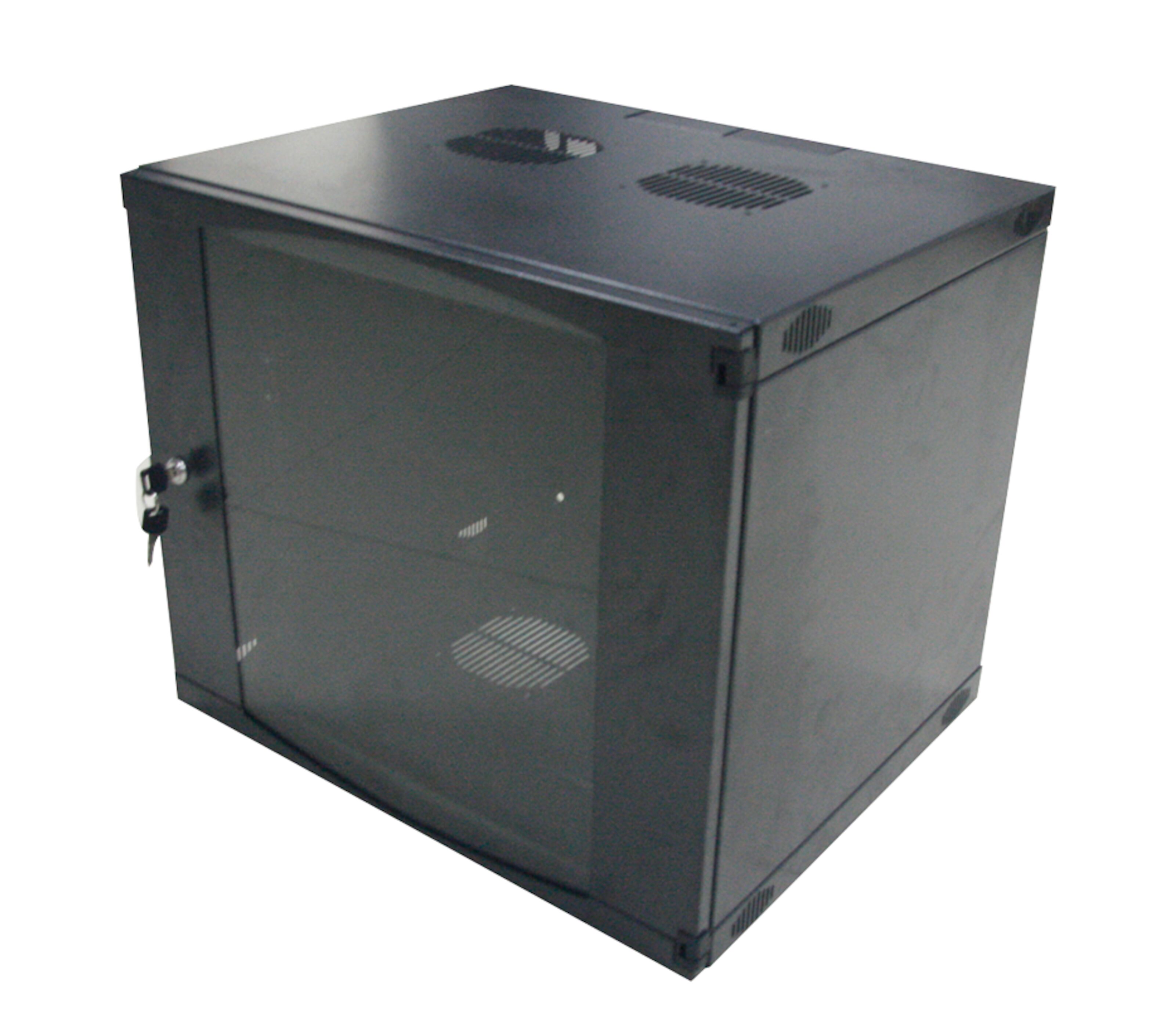 Stabilt veggskap for rackmontering av 19"-enheter. To justerbare skinner i front og låsbar dør i herdet glass. Kabelgjennomføringer på tre sider. Maks. belastning: 50 kg. Leveres umontert. Mål 6U: 540 x 330 x 450 mm, 9U: 540 x460 x4 50 mm.