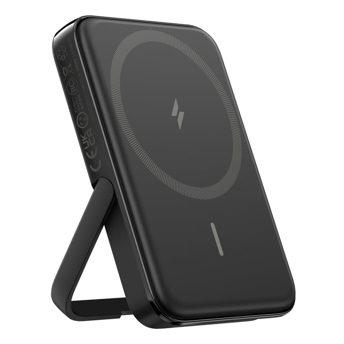 Magnetisk powerbank med innebygd mobilstativ for iPhone 12 og nyere. Festes på baksiden av mobilen og holdes fast ved hjelp av de innebygde magnetene. USB-C-tilkobling for lading av powerbanken, eller for å lade andre enheter (opptil 12 W). Det innebygde stativet er praktisk når du vil se film eller ringe med video. Kapasitet: 5000 mAh. Effekt: opptil 7,5 W.