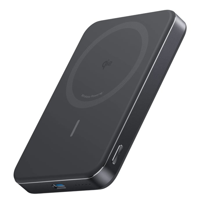 Magnetisk powerbank for iPhone 12 eller nyere og andre QI-kompatible telefoner med MagSafe-deksel. Festes på baksiden av telefonen og holdes på plass ved hjelp av innebygde magneter. Har LED-indikatorer som viser batteristatus og indikerer lading. Utstyrt med USB-C-port for lading av andre enheter, samt for opplading av selve powerbanken.