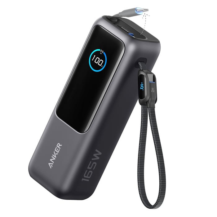 Anker Power Bank 25K (25 000 mAh, 165W) er en kraftig lader med tre USB-C-porter og innebygde kabler. Lad opptil fire enheter samtidig med rask og effektiv lading. Den smarte skjermen viser batteristatus i sanntid. Perfekt for reiser og daglig bruk.