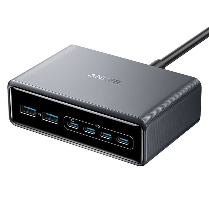 Anker Prime Charger 200W er en kraftig og kompakt ladestasjon med seks porter og støtte for rask lading på flere enheter samtidig. Perfekt for både reise og arbeidsplass, med GaN-teknologi, aktiv temperaturovervåkning og 200W total effekt fordelt på fire USB-C- og to USB-A-porter.