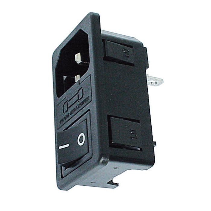 C14-apparatinntak med 2-pinners strømbryter og glassrørsikring (5 x 20 mm, følger ikke med) for kabinettmontering. Kabelen kobles via lodding eller flatstift (4,8 mm). Monteres i et 47 x 28 mm stort panelhull (maks. 1,35 mm paneltykkelse). Maks. 250 V / 10 A.