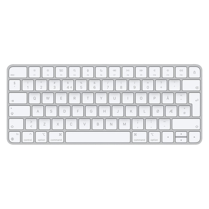 Med MagicKeyboard skriver du alltid komfortabelt og presist. I tillegg er det trådløst og oppladbart, og det har et innebygd batteri med utrolig lang batteritid, som kan vare mer enn en måned mellom ladinger. Tastaturet kobles automatisk til Macen, slik at du kan begynne å jobbe med en gang. Det følger også med en vevet USB-C-til-Lightning-kabel som kan kobles til en USB-C-port på Macen for sammenkobling og lading.