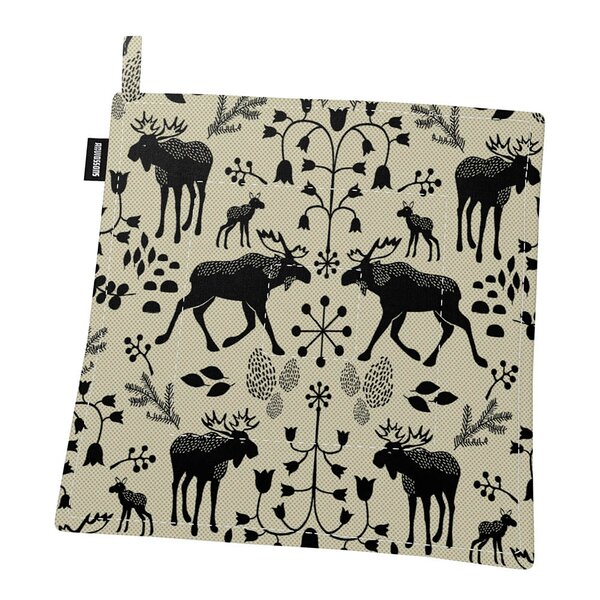 Skogens konung gryteklut svart fra Arvidssons Textil har et stemningsfullt mønster designet av Linda Svensson Edevint. Den mørke silhuetten mot lys bakgrunn gir en følelse av nordisk natur og skogsidyll. Stoffet er trykket i Spania og består av 80 % bomull og 20 % polyester. Størrelse: 22 x 22 cm. Vaskes på 30 °C. Krymper 3–4 %.