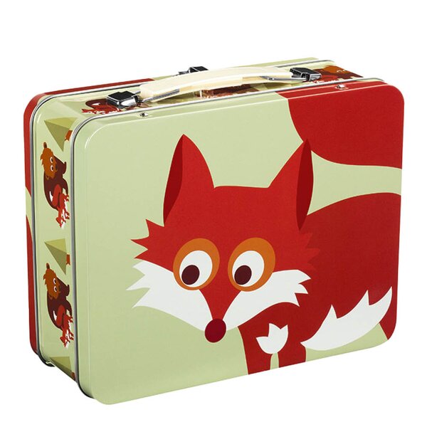 Denne grønne koffertboksen fra Blafre har et tydelig motiv med en stor rev, hentet fra serien "Skogsvenner". Med målene 8 x 16 x 19 cm er boksen både romslig og enkel å håndtere, og passer godt til oppbevaring av småsaker, tegnesaker eller tørrvarer. Boksen er godkjent for oppbevaring av tørr mat. Dersom maten er fuktig, anbefales det å bruke ekstra emballering som matpapir eller plastpose. Motivet gjør boksen til et sjarmerende innslag i barnerommet, kjøkkenet eller i sekken. For å bevare farger og mønster bør boksen vaskes for hånd med en fuktig klut og tørkes grundig etterpå. Den skal ikke stå fuktig eller vaskes i oppvaskmaskin.