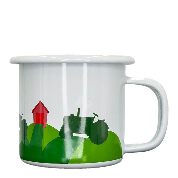 Denne blå emaljekoppen fra Blafre rommer 25 cl og har det klassiske "Traktor og låve"-motivet som fanger interessen hos barn som liker kjøretøy og gårdsliv. Illustrasjonen er fargerik og lett å kjenne igjen, og gir koppen en leken og tydelig karakter. Koppen er laget i emaljert stål og tåler bruk på komfyr, induksjonsplate og i ovn. Den kan vaskes i oppvaskmaskin, noe som gjør den enkel å rengjøre etter bruk hjemme eller ute. Den skal ikke brukes i mikrobølgeovn. Med sin robuste utforming og tydelige motiv er den godt egnet som turkopp eller som en fast del av barnets servise.