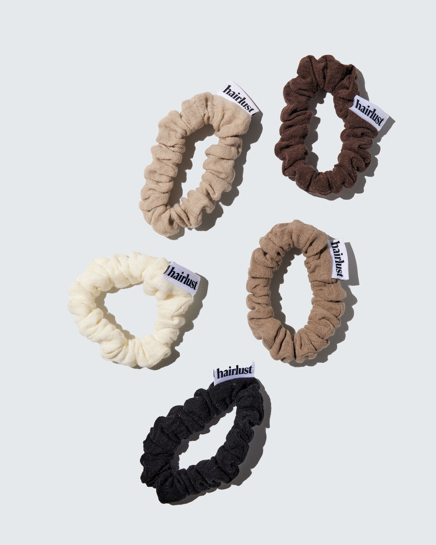 Tynne mini scrunchies laget av 100 % resirkulert bomull. Våre små scrunchies gir et sikkert hold og passer perfekt for mindre seksjoner med hår, fletter eller ønsker mer intrikate frisyrer som fortsatt er subtile.