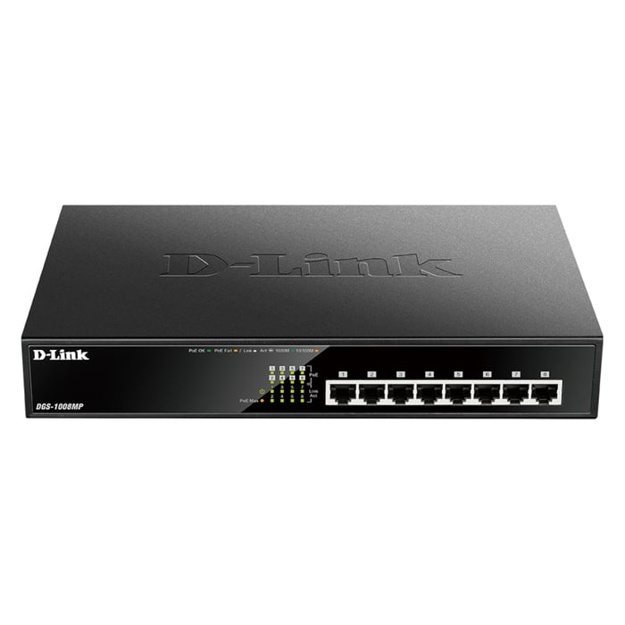 D-link DGS-1008MP er en vifteløs 1 Gb/s-switch med 8 nettverksporter med PoE+-støtte (dvs. mulighet til å strømforsyne POE-enheter via nettverkskabelen). Kan levere opptil 30 W per tilkobling (totalt 125 W). Bakplan: 16 Gb/s. PoE-standard: 802.3at, 802.3af og energieffektive 802.3az. Krever ikke konfigurering. Leveres med C13-strømkabel. Mål: 280x180x44 mm.