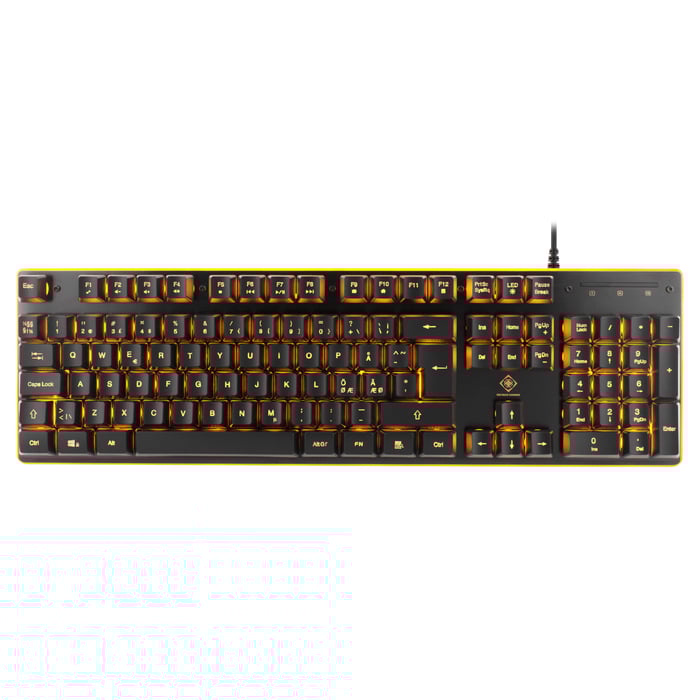 Ta spillingen til et nytt nivå med dette opplyste anti-ghosting-tastaturet. Utstyrt med oransje bakgrunnsbelysning for taster og sidepaneler. Belysningen kan mellom kontinuerlig og "breathing". Du kan også justere intensiteten i belysningen i fire trinn. Medietaster for enkel kontroll av volum og avspilling. Kobles til via den integrerte USB-A-kabelen.