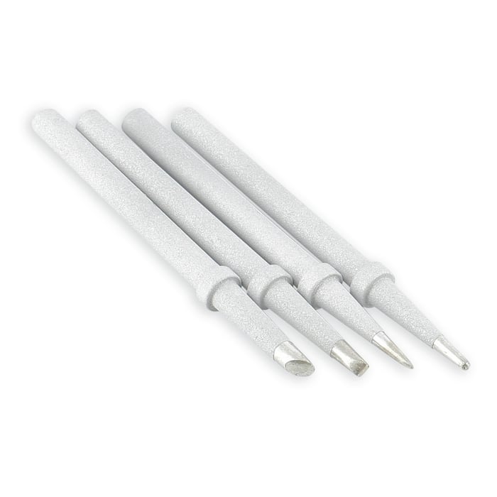 Ekstra loddespisser til 40712. Leveres med to spissformede (0,5 og 0,8 mm), én rund hov/skråfaset (3 mm) og én meiselformet (2,7 mm). Passer bl.a. til (40747).