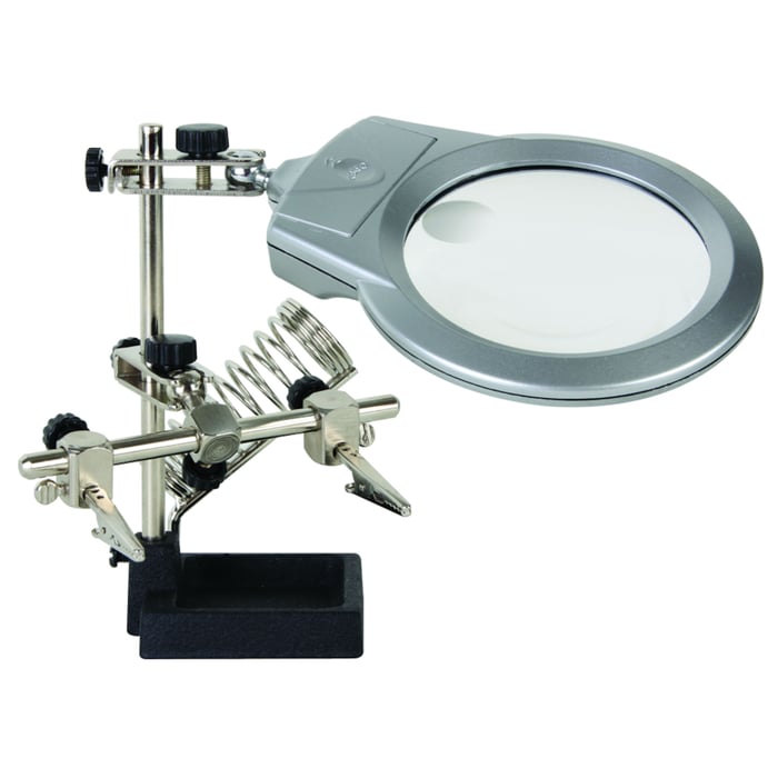 Regulerbar arm med to krokodillearmer, dobbeltslipt forstørrelsesglass, loddeboltstativ og LED-belysning. Utmerket for lodding eller annet arbeid der det kreves frie hender. Står på en stabil fot. Dioptrier: +3. Drives av 3x AAA-batterier (følger ikke med). Forstørrelsesglass: Ø90 mm.