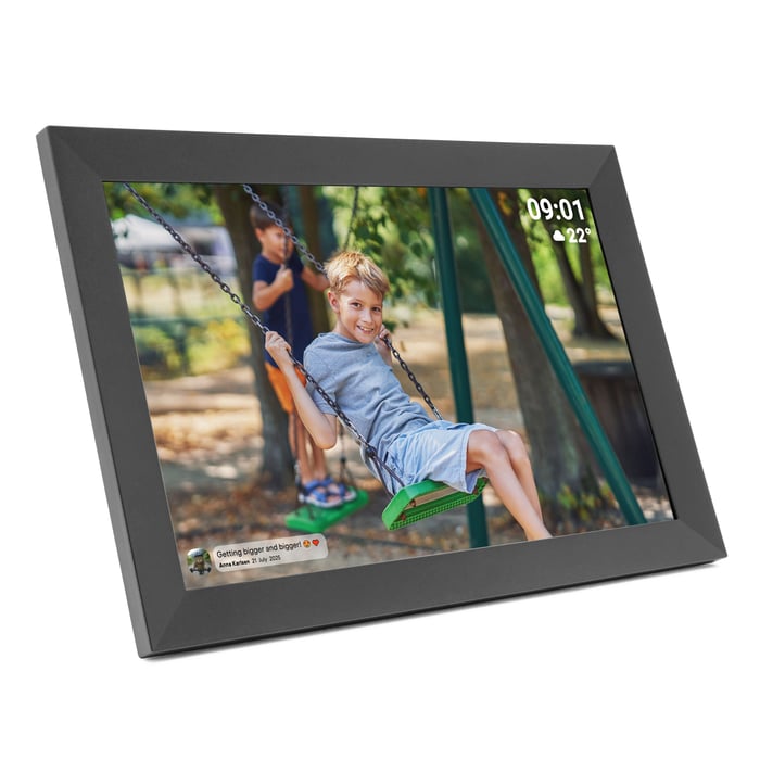 Send bilder og videoklipp fra nært og fjernt og la besteforeldre, venner eller familie ta del i minneverdige øyeblikk. Den digitale fotorammen tilkobles enkelt til hjemmets Wi-Fi og viser bilder som et levende bildespeil på den 10,1" store touchskjermen. Bildene sendes via Frameo-appen der også hilsninger og andre personlige tekster legges til.