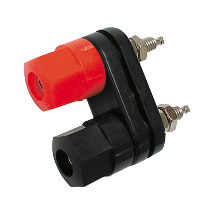 Isolert polskrue for 4 mm labplugg eller gaffelkabelsko. Panelhull: 2 x Ø 3,8 mm. Mål: 39 x 34 mm. Avstand mellom skruer: 20 mm. Maks 60 V 30 A.