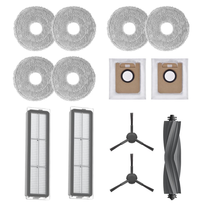 Orginaltilbehørssett til Dreame L20 Ultra. Inkluderer 1x hovedbørste, 2x hjørnebørster, 3x par mopper, 2x filtre og 2x støvsugerposer.