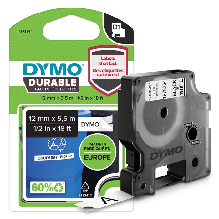 Ekstra robust hvit merketeip av typen D1, som passer i merkemaskiner i Dymos Labelmaker-serie. Den har ekstra sterk klebeevne og er UV-beskyttet, som gjør den egnet for utendørsbruk. Vannavvisende materiale som tåler både varme og kulde. Velegnet til f.eks. postkasser og matbokser. Farge: svart på hvit. Bredde: 12 mm. Lengde: 5,5 m.