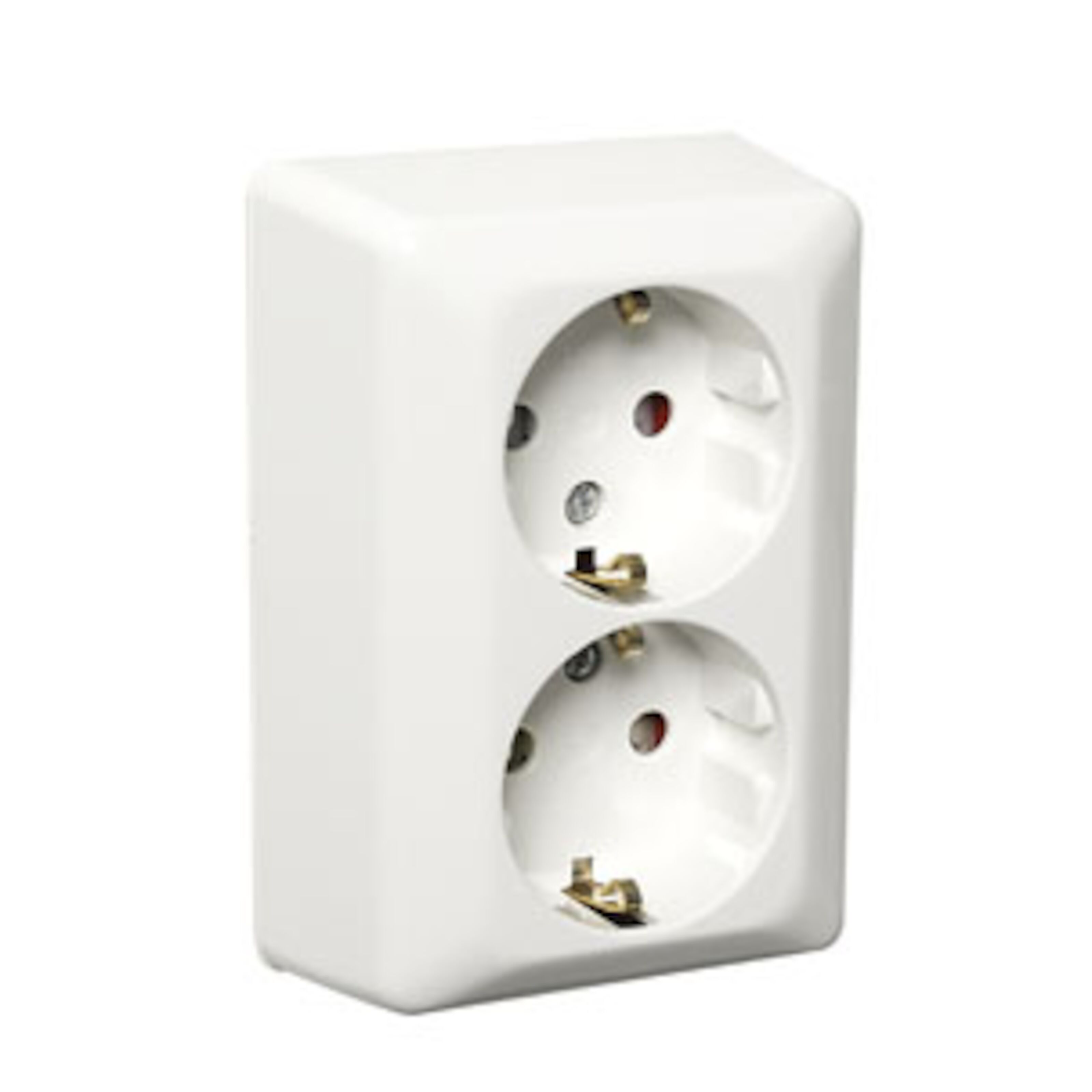 Utenpåliggende jordet 2-veis stikkontakt med skrueterminal fra Elko RS-serien. Farge: hvit. Maks. strøm: 16 A.