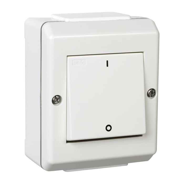 Utenpåliggende strømbryter for utendørsbruk (IP55). 2-polet (bryter både fase og null) med skrueterminal. Farge: fjellhvit. Maks. strøm: 10 A.