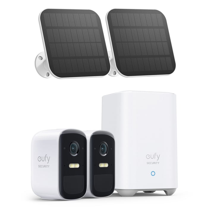 Føl deg trygg i hjemmet ditt – og borte fra hjemmet – med trådløse sikkerhetskameraer fra Eufy. EufyCam 2C Kit består av 2 helt trådløse kameraer med 180 dagers batterilevetid, Full HD-oppløsning og nattsyn sammen med sikker, kryptert og lokal lagring uten månedlige avgifter med den inkluderte basestasjonen. Dette inkluderer også to solcellepaneler for å støtte opplading av kameraene og forlenge batterilevetiden.