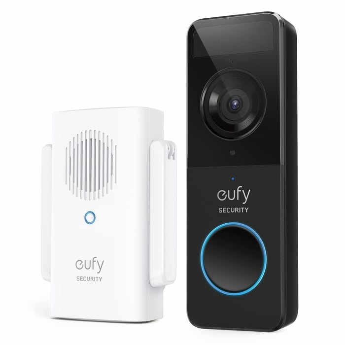 Eufy Video Doorbell 1080p er en trådløs dørklokke med Full HD-oppløsning og 4:3-format som gjør at du kan se mer. Med innebygd høyttaler og mikrofon kan du hilse på de som venter ved døren. Siden den er batteridrevet slipper du å tenke på ledninger. Med den medfølgende, wifi-tilkoblede Chime hører du når noen ringer på døren, og du kan lagre video og bilder lokalt og uten abonnement. Leveres med 16 GB Micro-SD-kort.