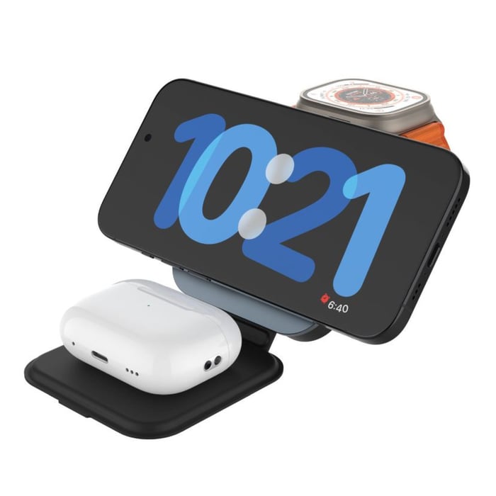 Elegant og portabel 3-i-1 trådløs lader med MagSafe-støtte for iPhone, AirPods og Apple Watch. Fungerer både som stativ og ladeplate – perfekt hjemme, på kontoret eller på reise. Lader iPhones (12 og nyere) med opptil 7,5 W og andre mobiler med opptil 15 W. Hodetelefoner lades på den syntetisk skinnbelagte flaten og Apple Watch via en uttrekkbar lader. Laget i aluminium og soft-touch-plast, og kan enkelt foldes sammen til et kompakt reiseformat.