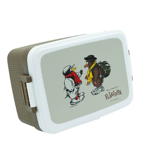 Flåklypa matboks med motivet Samtalen viser Solan og Ludvig i et kjent og populært øyeblikk fra Flåklypa-universet. Den retroinspirerte designen kombinert med en praktisk størrelse på 8x12x19 cm gjør boksen godt egnet for både skole, barnehage og tur. Den rommer 1000 ml og gir god plass til en variert matpakke. Matboksen har et ekstra løst lag med to rom som enkelt kan tas ut, noe som gir fleksibilitet i hvordan maten pakkes. Lokket åpnes og lukkes med en enkel mekanisme som gjør den lett å bruke, også for mindre barn.