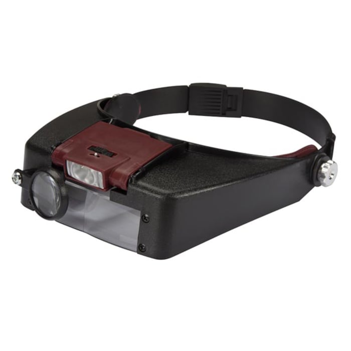 Forstørrelsesbriller med regulerbart hodebånd og belysning. Perfekt for lodding eller detaljarbeid der du trenger forstørrelse og frie hender. LED-belysning som kan vippes/vinkles. Linse i regulerbar forstørrelse: 0,375x, 0,75x, 2,125x og 2,5x. Drives av 2x AAA-batterier (følger ikke med). Vekt: 148 g.