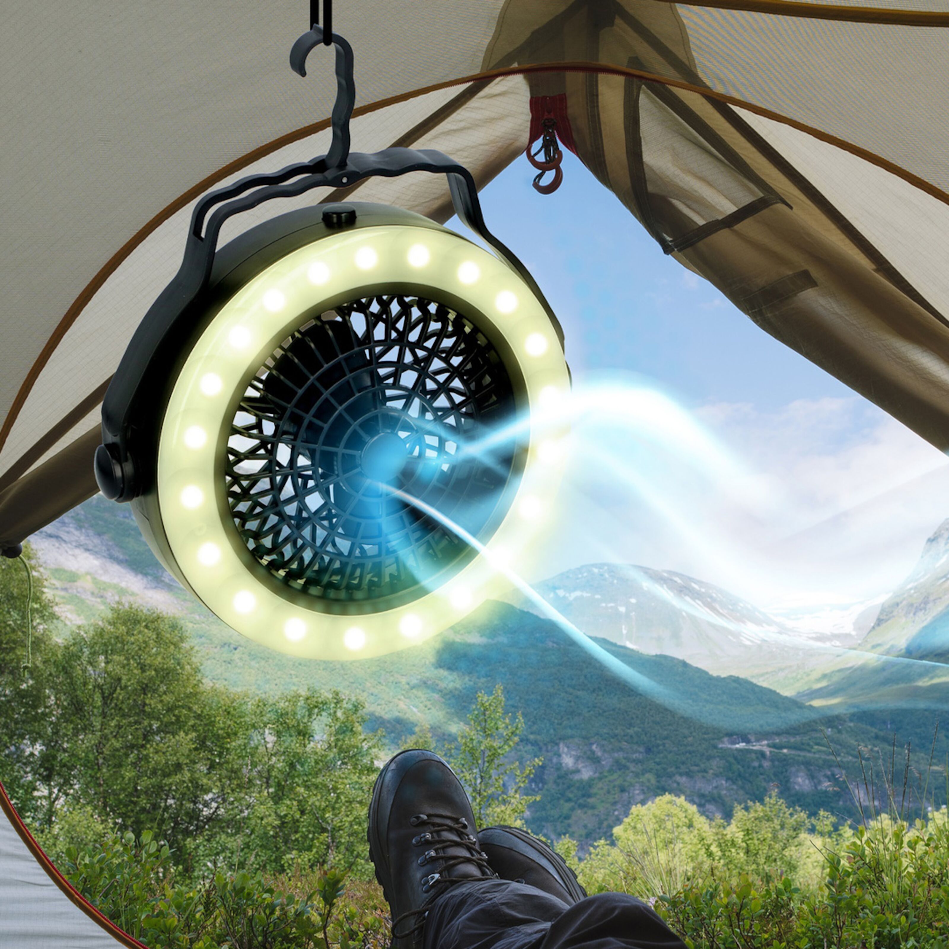Praktisk campinglampe med innebygd vifte. Kan brukes bare som lampe, vifte eller kombinert. Innebygd krok for enkel opphenging i telt eller fortelt. Kan vris 360° for enkel justering av lys og luftflyt. Drives av 3x AA-batterier (følger ikke med) med batteritid på ca. 30 timer. Antall LED-dioder: 12 stk. Vekt: 270 g. Lystemperatur: varmhvit.