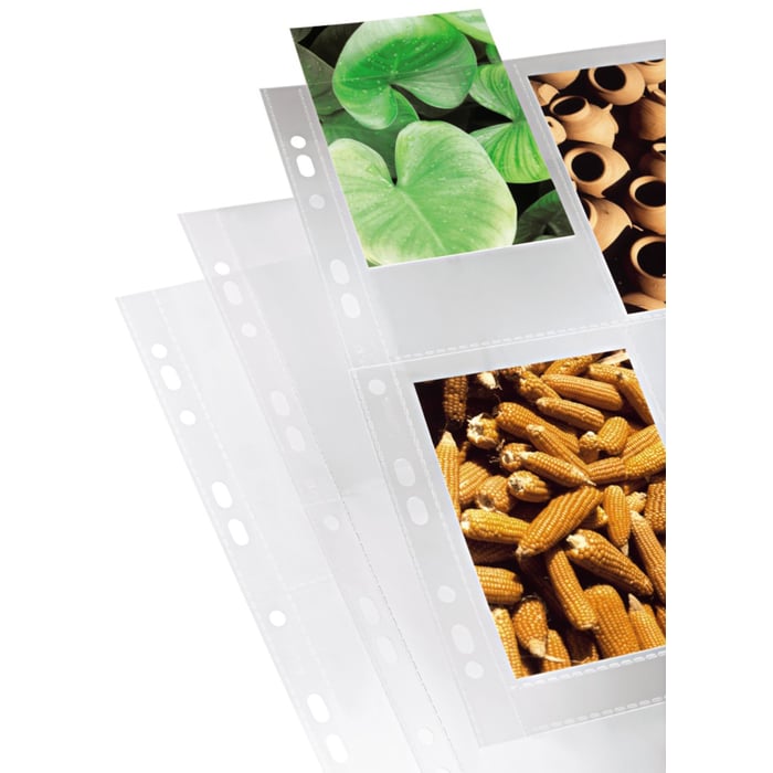 Robuste fotolommer for bilder på 10 x 15 cm. Plass til 4 + 4 bilder per ark. A4-format for perm eller album. Fremstilt av gjennomsiktig polypropylen som er robust, syrefri, pH-nøytral og fri for giftstoffer og mykningsmiddel. 10-pakning.