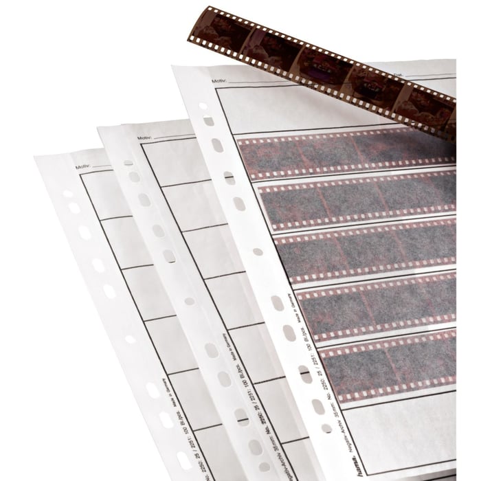 Negativark av pergamyn/matpapir. Organiserer og beskytter negativ- og lysbilderemser. Plass til 7 negativremser med 6 negativer per ark. Perforert for oppbevaring i perm. 25-pakning.