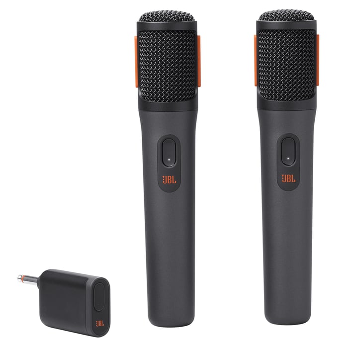 Gjør underholdningen enda bedre med JBL PartyBox Wireless Mics. Bare koble dem til en valg-fri JBL PartyBox (ikke inkludert) med den medfølgende dongelen for å få friheten ved en trådløs tilkobling. Stemmen din høres tydelig både inne og ute med disse mikrofonene, som er spesielt utformet for å få fantastisk lydkvalitet med alle PartyBox-høyttalere. En innebygd vindhette minimerer uønsket lyd når du synger duett med bestevennen, og et dempingssystem senker lyden når du gir mikrofonen til noen andre. Spilletid på opptil 20 timer.
