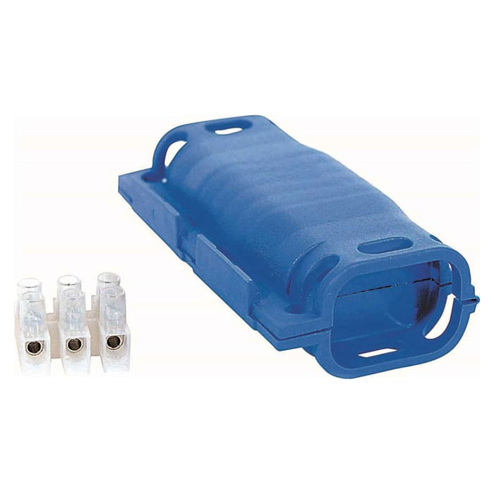 Gelfylt boks som kan gjenåpnes for effektiv fuktbeskyttelse av skjøter og forgreninger. For skjøting av strømkabler på opptil 450 V (3-polet, 1,5-2,5 mm²). Egnet for montering (på bakken) eller nedgraving. Laget av UV-bestandig polypropylen. Ubegrenset holdbarhet og levetid på minst 30 år ved installasjon. Leveres komplett med boks, 3-polet terminalblokk og buntebånd/strips. Klassifisering: IPX8. Temperaturområde: -20 °C til +90 °C. Mål: 86x47x27 mm.