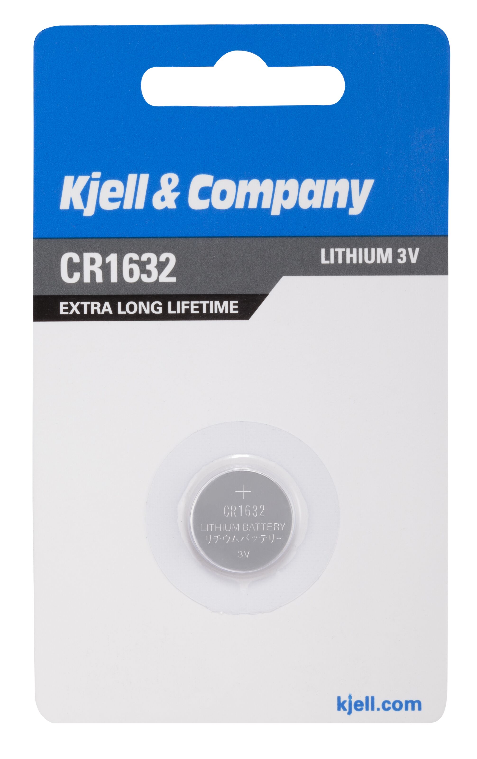 Knappcellebatteri CR1632. Vanlig i f.eks. bilnøkler. Spenning: 3,0 V. Kapasitet: 50 mAh. Mål: 16x3,2 mm.