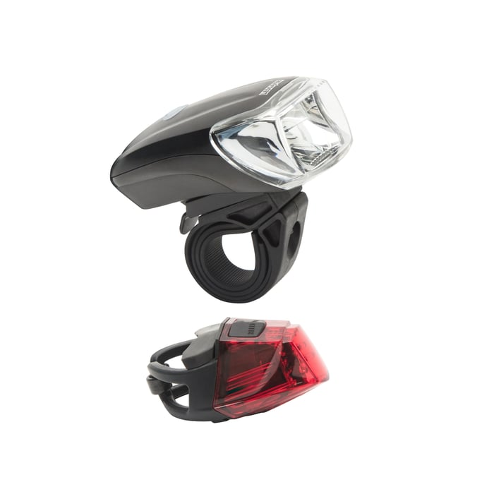 Værbestandige (IPX4) front- og baklykter for sykkel. Frontlykten har to lysstyrker (70 og 130 lm). Baklykten lyser rødt og har én lysinnstilling. StVZO-sertifiserte.