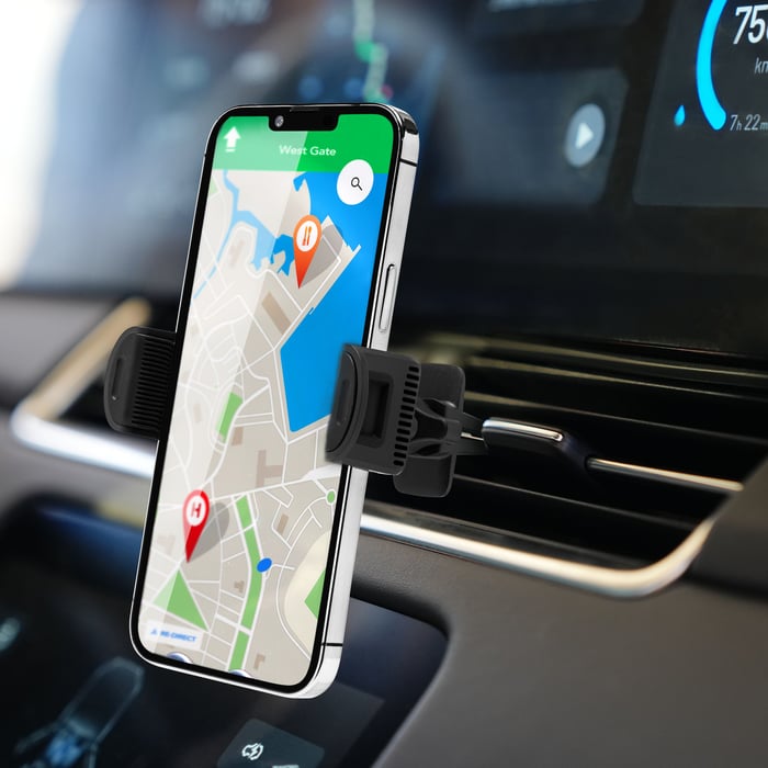 Universalholder for mobil eller GPS. Festes i bilens luftdyse og kan roteres 360°. Passer for modeller som er 55–85 mm brede.Utseendet til telefonholderen kan variere.