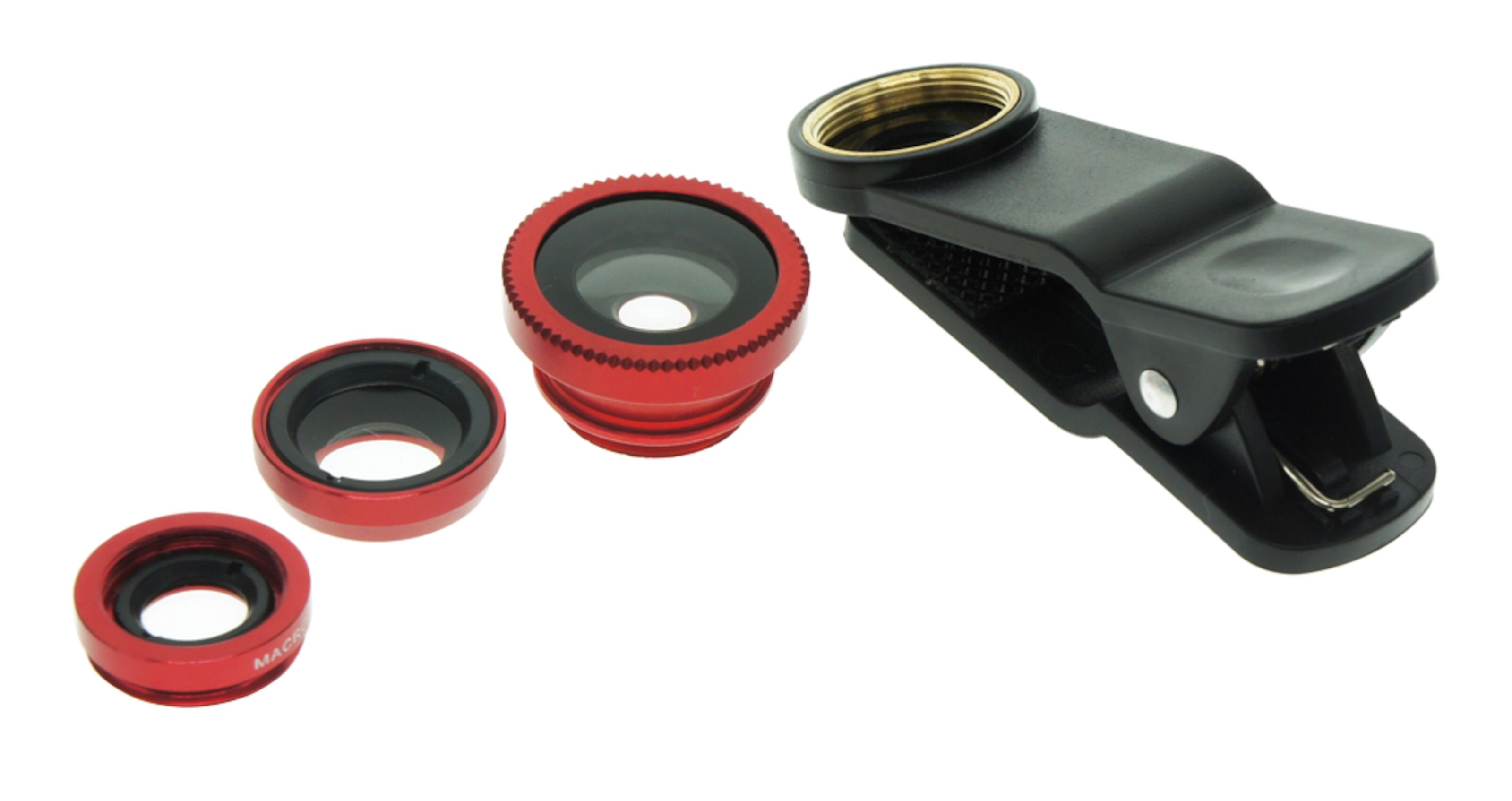 Sett med tre effektobjektiver for mobiltelefonkamera. Ved hjelp av universalklemmen plasseres linsene over mobiltelefonens kamera. Inneholder Fish Eye-objektiv for en vinkel på 180°, makroobjektiv for små objekter og vidvinkelobjektiv for brede motiver. Vidvinkelobjektivet monteres på makroobjektivet.