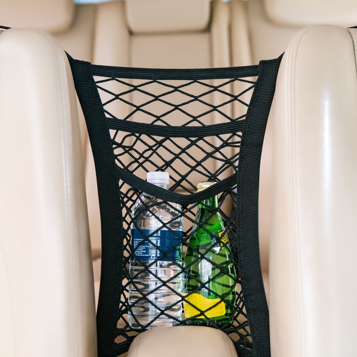Fleksibel oppbevaring for bilen. Plasseres mellom setene og rommer alt fra vannflasker til ladere og tilbehør. Elastisk materiale som passer de fleste avstander mellom fører- og passasjersetet. I tillegg til organiseringsmulighetene hindrer nettet husdyr i å bevege seg fritt i bilen.