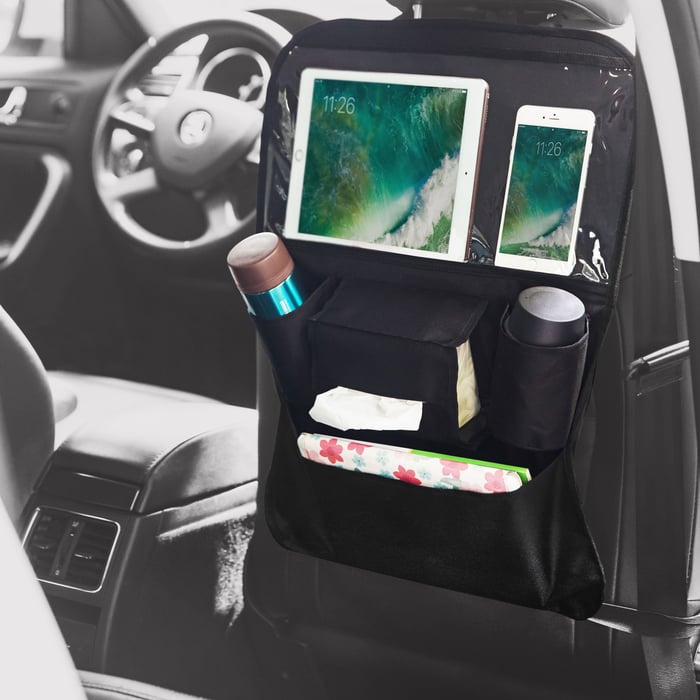 Universallomme og sparkebeskyttelse for oppbevaring av f.eks. flasker og bøker. Gjennomsiktig lomme for nettbrett og mobil. Også utstyrt med to holdere for flasker og mugger samt en lomme for servietter. Perfekt til barna under lange bilreiser. Laget av robust polyester som beskytter setet mot spark og skitne sko. Beskytteren monteres enkelt med krokene og passer de fleste bilmodeller. Rengjøres enkelt med en fuktig klut. Medlemstilbud: 20 % rabatt ved kjøp av 2 valgfrie mobiltilbehør fra Linocell »