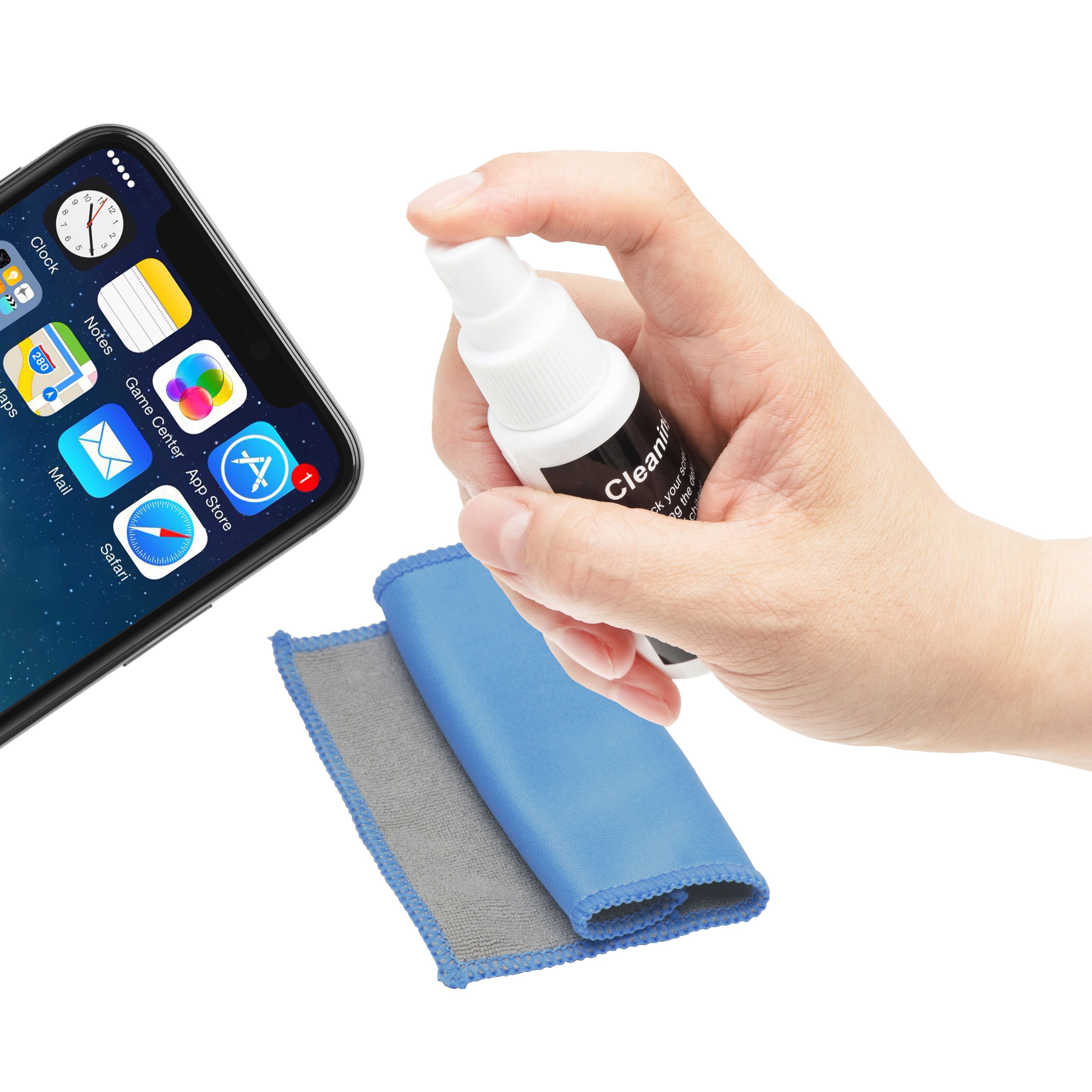 Rengjøringssett for effektiv rengjøring av mobiltelefoner og nettbrett, samt TV- og dataskjermer. Inneholder alkoholfri rengjøringsvæske i sprayform og en myk mikrofiberklut. Rengjøringsvæske: 35 ml. Mikrofiberklut: 10x15 cm.