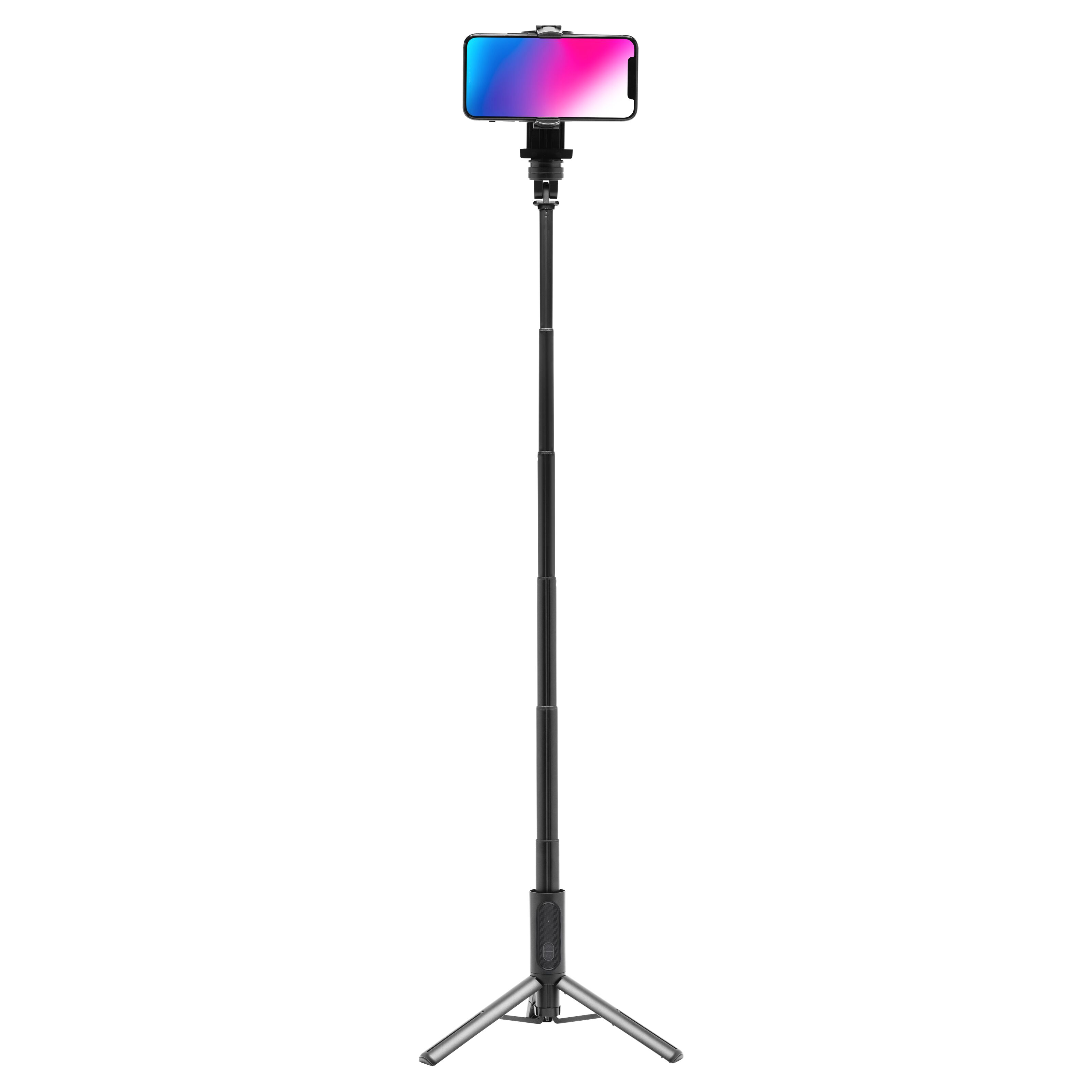En selfiestang med integrert stabilisering. Med stativet kan du plassere mobilen for å filme, eller for å ta bilde av deg selv på avstand. Fjernkontrollen oppbevares i enheten. Med et enkelt trykk bytter du fra portrett- til landskapsmodus, som innebærer at mobilen vender bildet 90°. Både fjernkontrollen og stabilisatoren lades via Micro-USB (USB-lader selges separat). Lengde på stativet: 195-716 mm. Vekt: 268 g. Batteritid: opptil 4 timer. Fjernkontrollens rekkevidde: ca. 10 m.