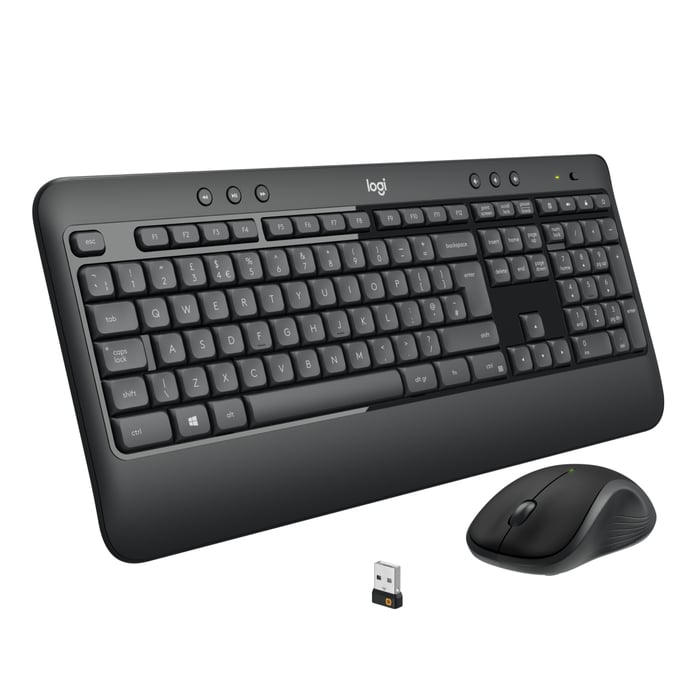 Pakke med trådløst tastatur i full størrelse og trådløs ergonomisk mus. Hurtigtaster på tastaturet, som mediefunksjoner, nettleser og e-post. Tastaturet tåler søling (opptil 60 ml) og har utfellbare føtter som kan stå i tre ulike vinkler (naturlig, 4° og 8°). Unifying-støtten gjør det mulig å bruke tastaturet og musen i f.eks. kontorlandskap. Siden enhetene og mottakeren er parkoblet, forstyrres de ikke av andre enheter. Opptil seks enheter kan være parkoblet til Unifying-mottakeren. Rekkevidde: opptil 10 m. Kompatibel med Windows 7, 8 og 10. Batteritid: opptil 3 år (tastatur) og 18 måneder (mus). Tastaturet drives av 2x AA-batterier (følger med) og musen av 1x AA-batteri (følger med). Nordisk tastaturoppsett. Mål på tastatur: 457x194x24 mm.