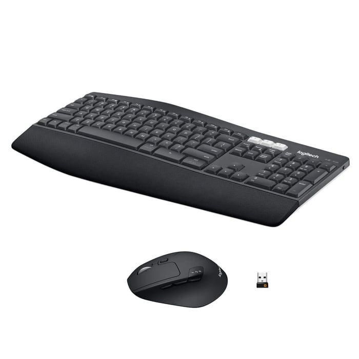 Logitech MK850 er ett kit med trådløs mus og tastatur i full størrelse med ergonomisk design. Tastaturet har justerbare ben, bøyd ramme og ekstra stor håndleddsstøtte for bedre komfort og ergonomi. Tastaturet har også programmerbare funksjonsknapper for f.eks. å åpne e-post og styre medier.