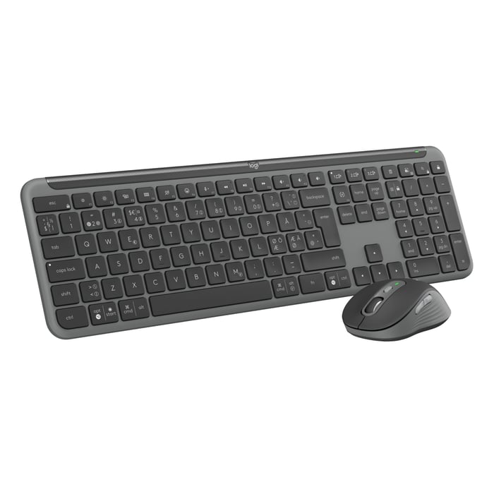 Pakke med trådløst tastatur i full størrelse og trådløs mus. Stille skriving og klikking gir deg mer fokus og mindre forstyrrelser for andre. Kobles til trådløst via Bluetooth eller den medfølgende Logi Bolt-mottakeren. Praktisk hurtigtast som gjør at du enkelt kan bytte mellom opptil 3 tilkoblede enheter.