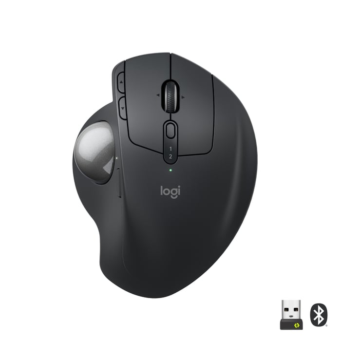 Datamus i Logitechs Ergo-serie der utformingen hjelper til med å redusere belastningen på hånd, håndledd og arm. Med MX Ergo S styrer du markøren på skjermen med styrekule i stedet for å bevege armen eller håndleddet. Musens bunnplate kan vinkles 20 grader for å avlaste underarmen ytterligere. Knappene er 80 % stillere sammenlignet med MX Ergo-modellen, og musen kan hurtiglades: 1 minutt gir opptil 24 timers batteritid. Kan være koblet til to datamaskiner samtidig.