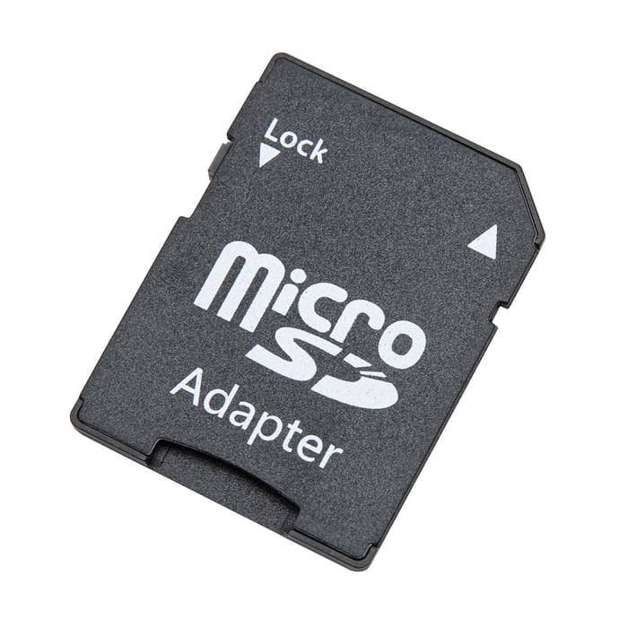 Adapter for å bruke et Micro-SD-kort som et SD-kort i vanlig størrelse. Utstyrt med låsebryter på siden, som gir muligheten til å forhindre endring og sletting av innhold på minnekortet. Fungerer med SD-, SDHC og SDXC-kort.