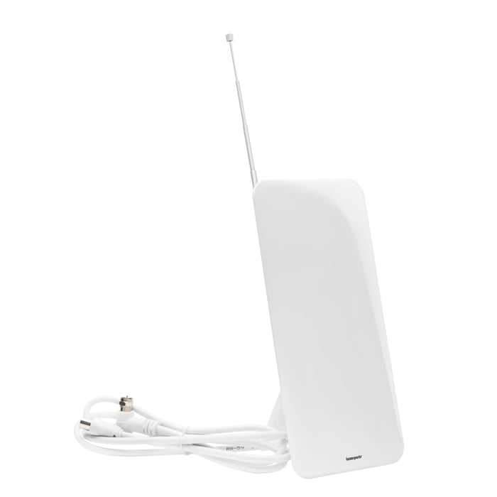 Aktiv innendørsantenne for DAB, DVB-T/T2 og FM. Kan henges på veggen eller stå oppreist ved hjelp av det innebygde bordstativet. Har 4G-filter for 800 MHz-båndet. Frekvensområde: 47-230 MHz (VHF) og 470-790 MHz (UHF). Innebygd forsterker på 20 dB. Leveres med strømadapter (230 V), strøminjektor (9 V) og antennekabel mellom injektor og antenne. Kobles til med F-kontakt mot antennen. Mål: 233x122x23 mm.