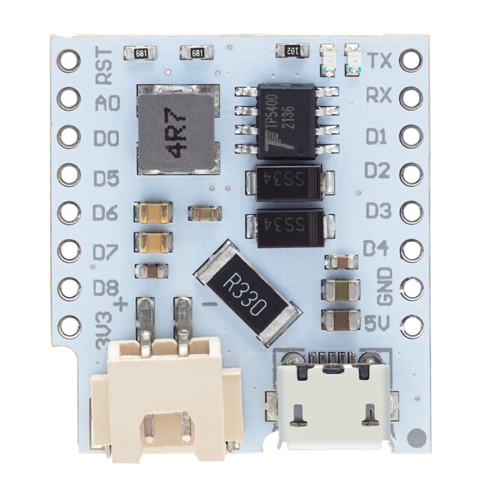 Batterimodul som gjør at du kan strømforsyne utviklingskort via et 3,7 V litiumbatteri. Forbindelse: JST-XH2.54.Batterimodulen muliggjør strømtilførsel og lading via Micro-USB-kontakten. Ladespenning: maks 10 V (5 V anbefales), maks. 1 A. Batterispenning: 3,3–4,2 V. Utstyrt med sikring som kan nullstilles (1 A).