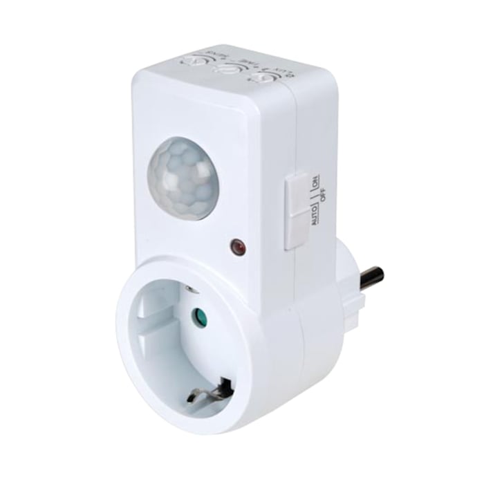 Bevegelsessensor som settes rett i stikkontakten og slår på tilkoblet enhet ved bevegelse. Tidsintervallet der enheten er påslått, kan stilles fra 10 s til 7 min. Registrerer bevegelser på opptil 9 meters avstand. Har også innebygd skumringsrelé som kan slå på eller av tilkoblet enhet ved daggry/skumring. Drives direkte fra stikkontakten og trekker kun 0,9 W. Mål: 50x95x60 mm.
