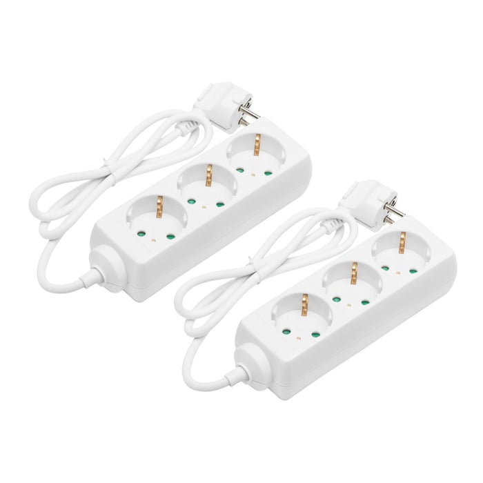 2-pk. med 3-veis jordede grenuttak. Maks. belastning: 3500 W. Kabeldimensjoner: 3x1,5 mm². Kabellengde: 1 m.