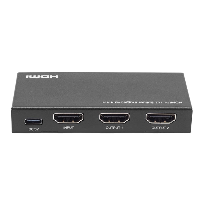 HDMI-splitter for å vise bildet fra en HDMI-kilde på flere HDMI-skjermer samtidig (dupliserer bildet). Maks. oppløsning: 8K/60 Hz. Drives av en USB-C-lader (5 V / 1 A), (ikke inkludert).