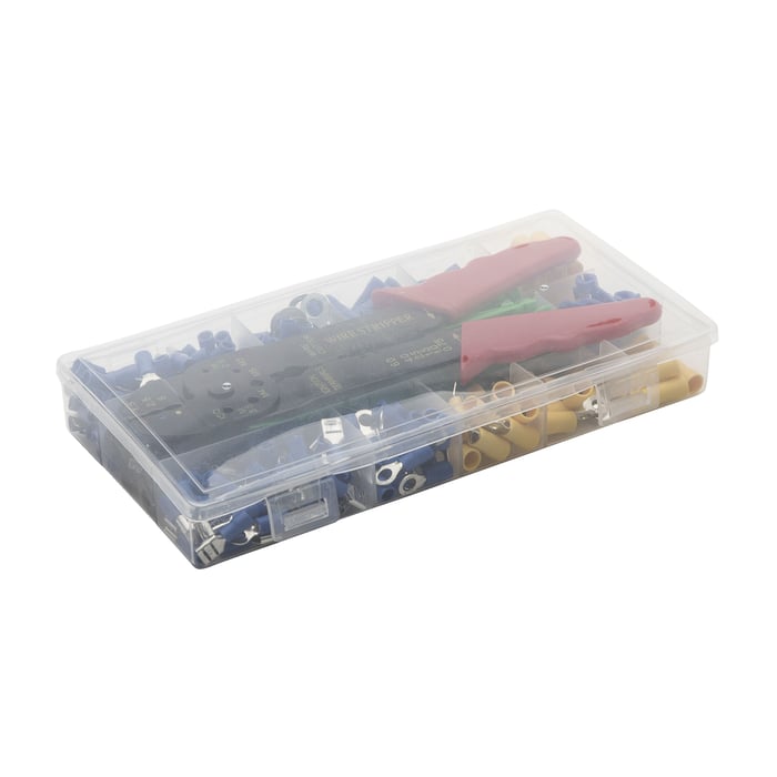 Sett med 200 stk. gule og blå kabelsko i ulike modeller og presstang med avisoleringsfunksjon. Inneholder også buntebånd, kabelgjennomføringer og klemmer med skruefeste.